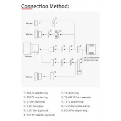 Cette caméra possède un filetage d'entrée de type M42 femelle (M42 x 0.75) et est livrée avec un convertisseur mécanique M42 au coulant 31,75 mm (1.25"), pour pouvoir glisser la caméra dans les portes-oculaires standards des télescopes et lunettes du marché.