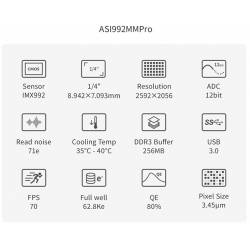 Le capteur monochrome (Noir & Blanc) Sony de la caméra ZWO ASI 992 MM-P compte 5,33 millions de pixels (2592 x 2056 pixels) dont l'usage la destine à l'astrophotographie des objets du ciel profond de petite taille apparente, mais aussi à l'imagerie planétaire.