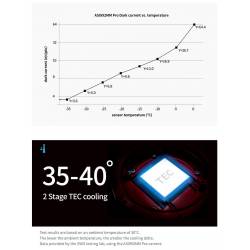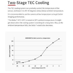 Le refroidissement de la caméra est obtenu grâce à deux étages TEC qui descendent la température à -35°C sous la température ambiante. Le refroidissement d'un capteur d'imagerie permet de gagner en rapport signal / bruit, donc en détectivité, de façon spectaculaire. Pour refroidir la caméra, vous aurez besoin d'une alimentation 12V / 5A (non fournie) que vous brancherez au dos de la caméra (voir l'onglet "Accessoires").