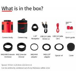 La caméra est également livrée avec 2 bagues allonge pour pouvoir positionner le capteur Sony à la bonne distance, en cas d'utilisation d'un réducteur de focale sur votre instrument. Sont fournies : une bague allonge de 21 mm du pas M42 (42 mm) vers le pas M42, et une autre de 16,5 mm au pas M42 vers le pas M48 (48 mm). Le lot compte aussi 4 bagues type spacers pour compléter les bagues allonges. Divers adaptateurs complètent le contenu (voir dernière photo).