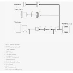 L'ASI183MM Pro possède un filetage d'entrée de type M42 femelle (M42 x 0.75) au coulant 50,8 mm (2"), et est livrée avec un convertisseur mécanique de 16,5 mm au pas M42 mâle vers le pas M48 (48 mm) femelle, puis un autre du M42 vers le coulant 31,75 mm, pour pouvoir glisser la caméra dans les porte-oculaires standards des télescopes et lunettes du marché.
