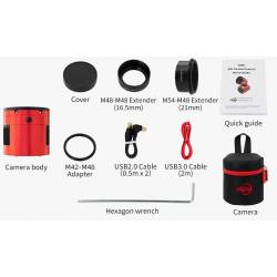Cette caméra possède un filetage d'entrée de type M54 femelle (M54 x 0,75 mm) et est livrée avec 2 bagues allonge pour pouvoir positionner le capteur à la bonne distance, en cas d'utilisation d'un réducteur de focale sur votre instrument. Sont fournies : une bague allonge de 21 mm de large au pas M54 mâle (54 mm) vers le pas M48 femelle, et une autre de 16,5 mm au pas M48 mâle vers le pas M48 femelle. Le lot compte aussi une bague de conversion M48 mâle ver M42 mm femelle (voir dernière photo pour le contenu complet de la livraison).