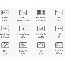 Caméra monochrome (N&B) refroidie, 6248 x 4176 pixels de 3,76 µm - 26 millions de pixels. Buffer 512Mo DDR3 pour un temps de lecture très rapide. Très grand champ et performante, format APS-C. Capteur → Monochrome CMOS IMX571 Back-Illuminated (BSI).