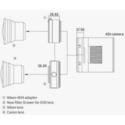 Cette caméra possède un filetage d'entrée de type M42 femelle (M42 x 0,75 mm) et est livrée avec 2 bagues allonge pour pouvoir positionner le capteur à la bonne distance, en cas d'utilisation d'un réducteur de focale sur votre instrument. Sont fournies : une bague allonge coulant 50,8 mm de 21 mm de large au pas M42 mâle (42 mm ou T-2) vers le pas M42 femelle, et une autre au coulant 50,8 mm de 16,5 mm de large avec filetage M42 mâle vers le pas M48 femelle. Le lot compte aussi une bague de conversion M48 mâle vers M42 mm femelle.