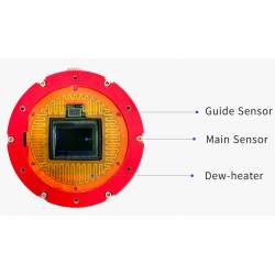 Caméra couleur double capteur refroidie, 6248 x 4176 pixels de 3,76 µm - 26 millions de pixels. Buffer 512Mo DDR3 pour un temps de lecture très rapide. Très grand champ et performante, format APS-C. Capteur → Couleur CMOS IMX571 Back-Illuminated. Capteur supplémentaire d'autoguidage CMOS SC2210 (1920 x 1080 pixels) N&B.