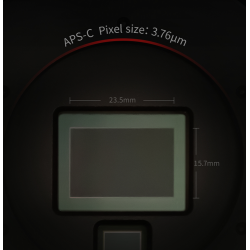 Caméra couleur refroidie, à double capteur, avec ASIAIR intégré. Capteur d'imagerie 6248 x 4176 pixels de 4 µm - 26 millions de pixels. Très grand champ, format APS-C. Capteur → Couleur CMOS IMX571 Back-Illuminated. Capteur supplémentaire d'autoguidage N&B-Monochrome CMOS SC2210 (1920 x 1080 pixels). Buffer 2Go DDR4 pour un temps de lecture très rapide.