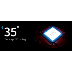 Le refroidissement de la caméra est obtenu grâce à deux étages TEC qui descendent la température à -30°C voire -35°C sous la température ambiante. Le refroidissement d'un capteur d'imagerie permet de gagner en rapport signal / bruit, donc en détectivité, de façon spectaculaire. Pour refroidir la caméra, vous aurez besoin d'une alimentation 12V / 5A (non fournie) que vous brancherez au dos de la caméra (voir l'onglet "Accessoires").