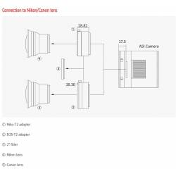 Cette caméra possède à l'avant un filetage d'entrée de type M54 femelle (M54 x 0,75 mm) et est livrée avec 2 bagues allonge M54 pour pouvoir positionner le capteur à la bonne distance, en cas d'utilisation d'un réducteur de focale sur votre instrument. Sont fournies : une bague allonge de 21 mm de large au pas M54 mâle (54 mm) vers le pas M54 femelle, une autre bague de 16,5 mm de large avec filetage M54 mâle vers le pas M54 femelle, et enfin une bague de conversion avec filetage M54 mâle vers le pas M48 femelle.