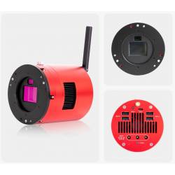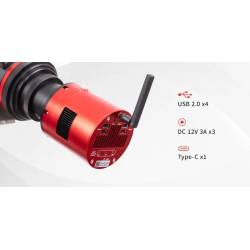 Ce modèle est une caméra 3 en 1 avec double capteur (pour l'imagerie et l'autoguidage) ; elle est en plus équipée d'un système ASIAIR intégré de manière à contrôler de la caméra à distance en modes WiFi et Bluetooth. L'antenne externe fournie avec la caméra, est à double bande, permettant une prise en charge des fréquences 2,4GHz et 5GHz pour une utilisation stable et fluide dans un rayon de 20 mètres.