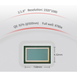 Cette caméra est pourvue d'un deuxième capteur (monochrome - Noir et Blanc -) en parallèle du premier, qui permet l'autoguidage depuis le foyer de votre instrument. Ce capteur comporte 2 millions de pixels (1920 x 1080 pixels), et possède un rendement quantique de 92% (voir plus bas).