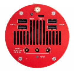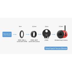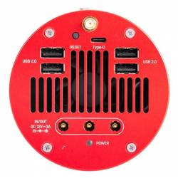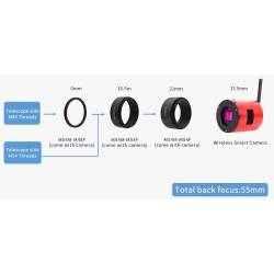 Cette caméra possède à l'avant un filetage d'entrée de type M54 femelle (M54 x 0,75 mm) et est livrée avec 2 bagues allonge M54 pour pouvoir positionner le capteur à la bonne distance, en cas d'utilisation d'un réducteur de focale sur votre instrument. Sont fournies : une bague allonge de 21 mm de large au pas M54 mâle (54 mm) vers le pas M54 femelle, une autre bague de 16,5 mm de large avec filetage M54 mâle vers le pas M54 femelle, et enfin une bague de conversion avec filetage M54 mâle vers le pas M48 femelle.