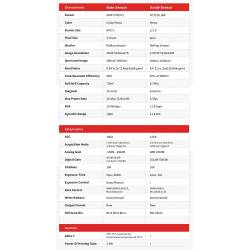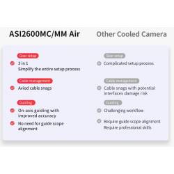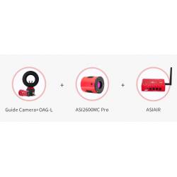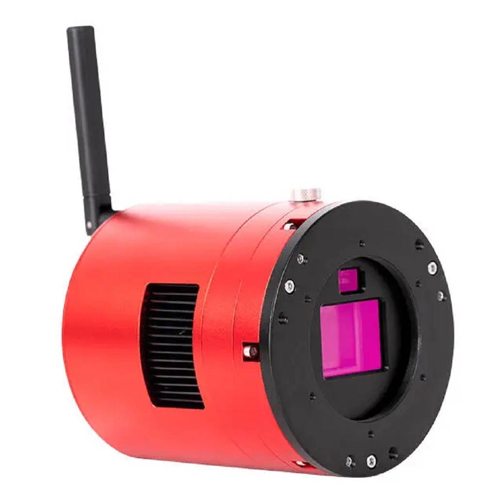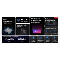 Ce modèle est une caméra 3 en 1 avec double capteur (pour l'imagerie et l'autoguidage) ; elle est en plus équipée d'un système ASIAIR intégré de manière à contrôler de la caméra à distance en modes WiFi et Bluetooth. L'antenne externe fournie avec la caméra, est à double bande, permettant une prise en charge des fréquences 2,4GHz et 5GHz pour une utilisation stable et fluide dans un rayon de 20 mètres.