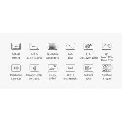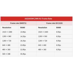 Le grand capteur imageur monochrome de la caméra ZWO ASI 2600 MM-Air compte 26 millions de pixels (6248 x 4176 pixels) dont l'usage la destine à l'astrophotographie des objets du ciel profond à grand champ. Avec un rendement quantique de 91%, le capteur principal (capteur imageur) de cette caméra réserve des performances de haut niveau. Il est à la fois sensible et possède un niveau de bruit thermique très faible.