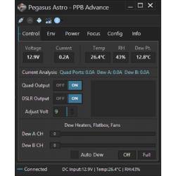 Le Pocket Powerbox Advance Gen2 peut fonctionner en tant qu'appareil autonome. Branchez simplement les câbles et vous êtes prêt pour l'astrophotographie. Donc, si vous désirez ne pas connecter un PC à chaque fois, vous avez la possibilité de ne pas à le faire.