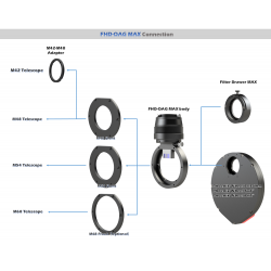 Le prisme servant à prélever la lumière, est relativement large (8 mm x 14 mm), ce qui donne plus de chances de pouvoir "attraper" une étoile guide. Le diviseur optique est livré avec un assortiment de bagues adaptatrices pour fixer votre imageur et votre caméra de guidage dans l'axe optique de votre instrument :