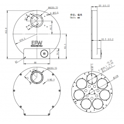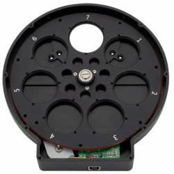 Roue à filtres motorisée ZWO 7 positions version II, pour accueillir 7 filtres au diamètre 36 mm non montés. Backfocus 20 mm.