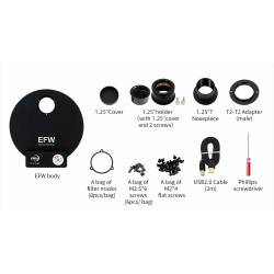 Le colis contient le corps de la roue à filtres électronique EFW 7 d'un poids de 400 g, un adaptateur T2 (M42 mm x 0,75 mm), un adaptateur coulant 31,75 mm (1.25"), un adaptateur T2-T2 mâle, 2 tubes allonges 31,75 mm de diamètre, tous les caches et vis pour fixer les filtres 36 mm et un câble d'alimentation de type USB 2.0 (voir dernière image).