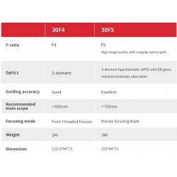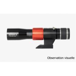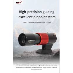 La mini lunette guide ZWO 30/150 mm (diamètre 30 mm, focale 150 mm, F/D=5) est l'instrument guide idéal pour les focales petites et moyennes (de l'ordre de 1000 mm). Légère (348 g), très bonne optique apochromatique, compacité, elle est dotée des meilleurs atouts pour vous permettre d'autoguider votre instrument principal dans les meilleures conditions.