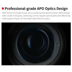 La qualité du guidage dépend également de la qualité optique de l'objectif principal : ZWO a doté cette mini lunette d'un objectif triplet apochromatique avec un verre ED (Extra low Dispersion - ou dispersion très basse de lumière). La qualité résultante, donne des images d'étoiles précises et ponctuelles.