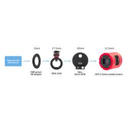 Cette bague à filetage intérieur M48 est compatible avec la roue à filtres ZWO EFW 2" ou l'OAG à filetage M68 et a été spécialement conçue pour s'adapter sur la face avant des caméras ZWO ASI2600, ASI6200 et ASI2400.