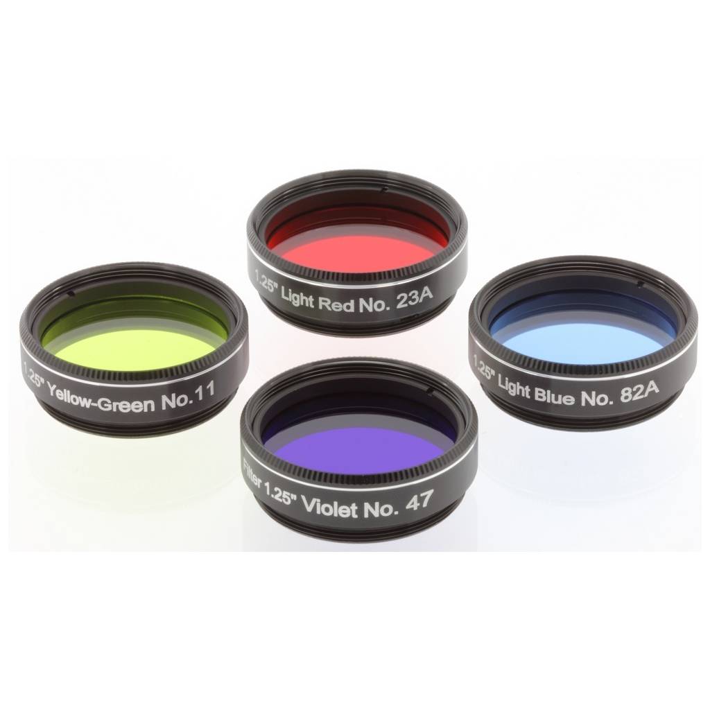 Set de 4 filtres colorés Explore Scientific spécial Lune et planètes, conviennent pour une lunette ou un télescope à partir de 150 mm de diamètre. Diamètre des filtres 31,75 mm (1.25").