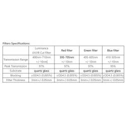Les filtres Antlia LRGB de la série Dark diamètre 50 mm, sont conçus avec une courbe spectrale visible complète et des plages de longueurs d'onde spécifiques : L : 400-710 nm, R : 595-705 nm, V : 495-605 nm, B : 410-505 nm. Ils offrent un rapport signal/bruit et un contraste élevés pour l'imagerie du ciel profond en spectre complet.