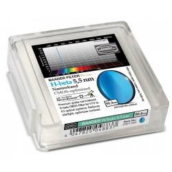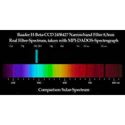 Filtre Baader H-Beta 5.5 nm nouvelle génération, optimisé pour les capteurs de type CMOS. Diamètre 50,4 mm non monté. Recommandé pour les instruments ouverts entre f/10 et f/3,5. Bande centrale de transmission 486,1 nm.