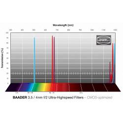 Jeu de 3 Filtres Baader UNB SII 4nm - H-Alpha 3,5nm - OIII 4 nm (SHO) UNB nouvelle génération, hautes rapidité pour les télescopes très ouverts (entre f/1,8 et f/3,4). Filtres optimisés pour les capteurs de type CMOS. Section carrée 65 x 65 mm. Filtres non montés. Bandes centrales de transmission 671,7 nm / 656,3 nm / 500,7 nm.
