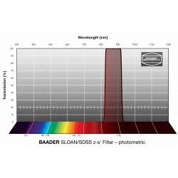Filtre photométrique Baader SLOAN/SDSS (ugriz') z-s' nouvelle génération, section carrée 65x65 mm non monté en bague, fonctionne sur les télescopes ouverts entre f/1,8 et f/15. Filtre optimisé pour les capteurs de type CMOS, bien que ses performances soient tout égales avec un capteur CCD.