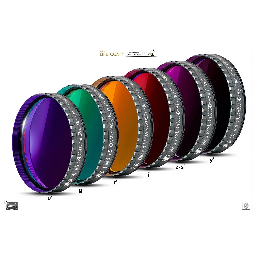 Filtres photométriques Baader SLOAN/SDSS (ugriz') nouvelle génération, diamètre 50,8 mm, fonctionnent sur les télescopes ouverts entre f/1,8 et f/15. Filtres optimisés pour les capteurs de type CMOS, bien que leurs performances soient tout aussi égales avec un capteur CCD.
