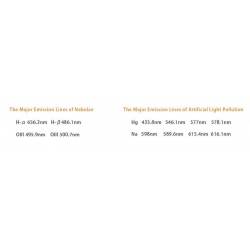 Il bloque la pollution lumineuse, maximise le signal des nébuleuses et assombrit le fond du ciel. Il bloque également la lumière artificielle des lampes à vapeur de mercure, des lampes à vapeur de sodium à haute et basse pression et la lumière naturelle indésirable causée par l'émission d'oxygène neutre dans notre atmosphère. Maximise la transmission des principales raies d'émission des nébuleuses en OIII (496 nm et 500 nm), H-alpha (656 nm), SII et H-Beta.