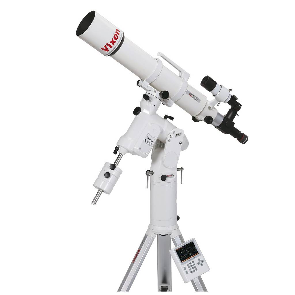 Lunette astronomique Vixen sur monture équatoriale SXP2 Goto. Objectif apochromatique, diamètre 103 mm, focale 795 mm (F/D=8). Livrée avec 2 oculaires 20 mm et 5 mm, chercheur 7x50, trépied SXG-HAL130.