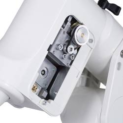 Les moteurs AD (Ascension Droite) et DEC (Déclinaison) sont intégrés dans la partie basse du bloc de déclinaison, de sorte que le centre de gravité se trouve sous les axes AD et DEC. Ainsi, c'est le bloc de déclinaison qui sert de contrepoids. De plus, grâce à la tête plate de la monture, celle-ci peut être équilibrée avec moins de contrepoids.