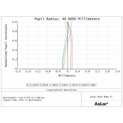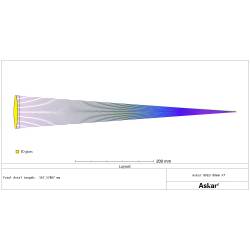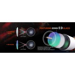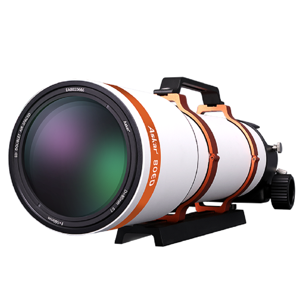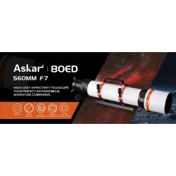La lunette Askar 80ED est une lunette de 80 mm de diamètre et 560 mm de focale. Son chemin optique est composé d'un doublet achromatique (2 lentilles) traité multi-couches. Le doublet est composé d'un verre conventionnel, et d'un verre ED (Extra Low Dispersion-) qui diffuse très peu la lumière et délivre des images nettes et contrastées, tout en réduisant considérablement les aberrations chromatiques, pour des images exemptes de couleurs indésirables.