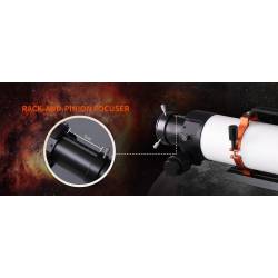 Le système de mise au point est un RPA (Rack & Pignon) démultiplié au 1/10ème de tour et a une course de 7 cm. Il s'agit d'un modèle usiné CNC qui circule sur 1 rail à crémaillère. Au coulant 50,8 mm (2") et 31,75 mm (1.25"), il permet d'accueillir un grand nombre d'oculaires du marché. Son diamètre de 2" (51 mm) en fait un porte-oculaire robuste, doux et précis. La démultiplication 1/10ème, apporte une précision redoutable sur la mise au point, très utile en planétaire et à fort grossissement en général.
