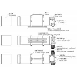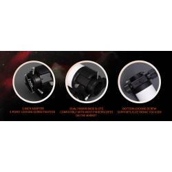 Le tube optique est équipé de 2 emplacements femelles placs de part et d'autre du tube porte-oculaire et dotés d'une vis de blocage pour recevoir simultanément 1 chercheur et une petite lunette guide (non inclus) dotés de leur support standard.