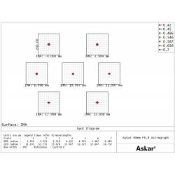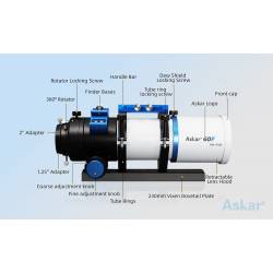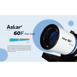 L'astrographe Askar 60-F (Flat en anglais, Plat en français) est une lunette apochromatique de 60 mm de diamètre et 408 mm de focale, produisant un champ plat, sans aberration optique. Son chemin optique Petzval est composé d'un quadruplet apochromatique (4 lentilles) traité multi-couches : il diffuse très peu la lumière (l'objectif triplet frontal comporte une lentille centrale en verre ED -Extra Low Dispersion-) et délivre des images nettes et contrastées jusque sur les bords du champ.