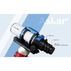 L'arrière de la lunette comporte un filetage mâle en M64 mm. Toutefois, la lunette Askar APO 60F est livrée avec une bague au coulant 50,8 mm vers le coulant 31,75 mm pour l'observation visuelle. Cette bague comporte à l'intérieur, un filetage femelle en M48 mm x 0,75 mm pour y adapter un filtre de diamètre 50,8 mm (2").