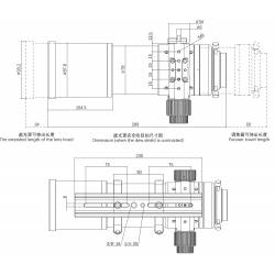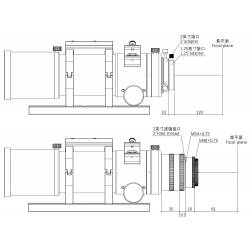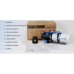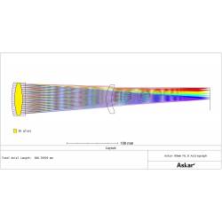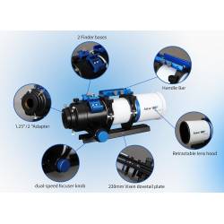 Cet objectif triplet ED de haute qualité est complété, à l'intérieur du tube optique, d'un correcteur composé d'un seul élément optique (formule Petzval). Il en résulte une image plane sur un cercle d'image de 44 mm de diamètre, permettant l'utilisation de caméra d'imagerie à capteur grand format.