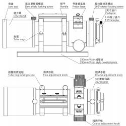 Une poignée ergonomique double emploi permet de transporter la lunette très facilement, mais aussi, par exemple, peut recevoir une petite lunette guide équipée d'une caméra de guidage. Une fente en guise de viseur est prévue sur la poignée de la lunette.