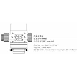 Le système de mise au point est un RPA (Rack & Pignon) démultiplié au 1/10ème de tour et a une course de 3 cm. Il s'agit d'un modèle qui circule sur 1 rail à crémaillère. Son diamètre de 2.4" (64 mm) en fait un porte-oculaire robuste, doux et précis. La démultiplication 1/10ème, apporte une précision redoutable sur la mise au point.