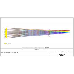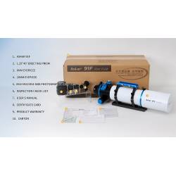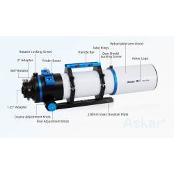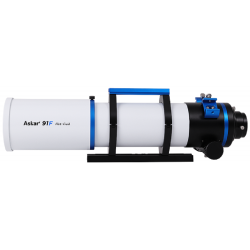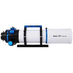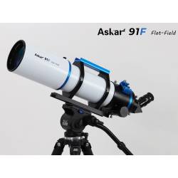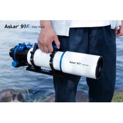 L'astrographe Askar 91-F (Flat en anglais, Plat en français) est une lunette apochromatique de 91 mm de diamètre et 609 mm de focale, produisant un champ plat, sans aberration optique. Son chemin optique Petzval est composé d'un quadruplet apochromatique (4 lentilles) traité multi-couches : il diffuse très peu la lumière (l'objectif triplet frontal comporte une lentille centrale en verre ED -Extra Low Dispersion-) et délivre des images nettes et contrastées jusque sur les bords du champ.