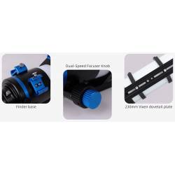 2 sabots femelles permettent de recevoir simultanément un chercheur (non inclus) doté de son support standard, ainsi qu'une petite lunette guide avec caméra de guidage, pour l'astrophotographie longue pose.
