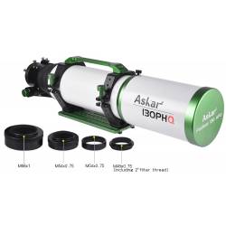L'arrière de la lunette comporte un filetage mâle en M86 mm x 1 mm, auquel vient s'ajouter un adaptateur au coulant 50,8 mm lui-même doté d'une adaptation en coulant 31,75 mm (2" et 1.25"). Toutefois, la lunette Askar 130PHQ est livrée en tout avec 4 adaptateurs à filetages standards qui se vissent les uns sur les autres pour pouvoir y connecter vos accessoires astrophotographiques :