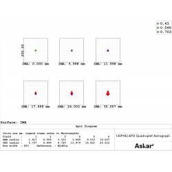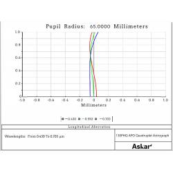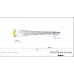 L'astrographe Askar 130PHQ est une lunette apochromatique de 130 mm de diamètre et 1000 mm de focale. Son chemin optique est composé d'un quadruplet apochromatique (4 lentilles) traité multi-couches : il diffuse très peu la lumière (l'objectif triplet frontal est en verre ED -Extra Low Dispersion-) et délivre des images nettes et contrastées jusque sur les bords du champ.
