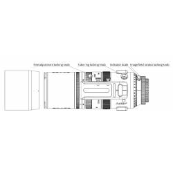 Le téléobjectif est rotatif sur 360° pour pouvoir cadrer au mieux l'objet céleste à photographier. Il est orientable via un bouton qui pourra également servir au blocage de la position. Un vernier gradué vous aidera à retrouver certaines positions particulières. Ce système rotatif permet d'orienter votre imageur de manière à optimiser le cadrage de l'objet céleste à photographier, en particulier si cet objet couvre un champ large, dans une diagonale par exemple.