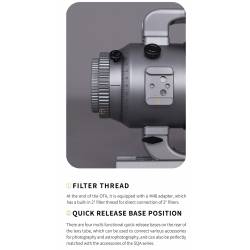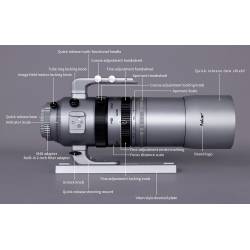 Objectif livré seul avec son support de fixation en queue d'aronde de type Vixen.