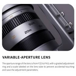 Une troisième bague rotative permet de fermer ou ouvrir en grand sur 14 positions, le diaphragme incorporé, pour contrôler l'ouverture de l'objectif. Le diaphragme est utile en photographie animalière ou de pleine nature, lors de séances photos en pleine journée. Les ouvertures possibles vont de f/4,8 en pleine ouverture, à f/22 diaphragme fermé.
