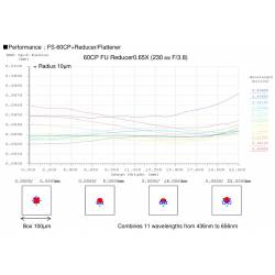 Vendu séparément, cet accessoire optique haut de gamme et à hautes performances, est doté de 4 lentilles dont l'une est en verre fluorite. Il élimine presque entièrement l'aberration chromatique qui n'a pas pu être corrigée par le précédent réducteur C0.72x utilisé sur la lunette FS-60CB : il réduit ainsi l'aberration chromatique à moins de la moitié de ce qu'elle était auparavant sur la lunette FS-60CB.