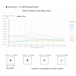 La courbure de champ est également corrigée sur la totalité des clichés grâce au réducteur FU 0,65x, y compris sur un appareil grand format 24 x 36 mm. Le rayon RMS (réduit à moins de 2 microns) est homogène depuis le centre vers la périphérie.
